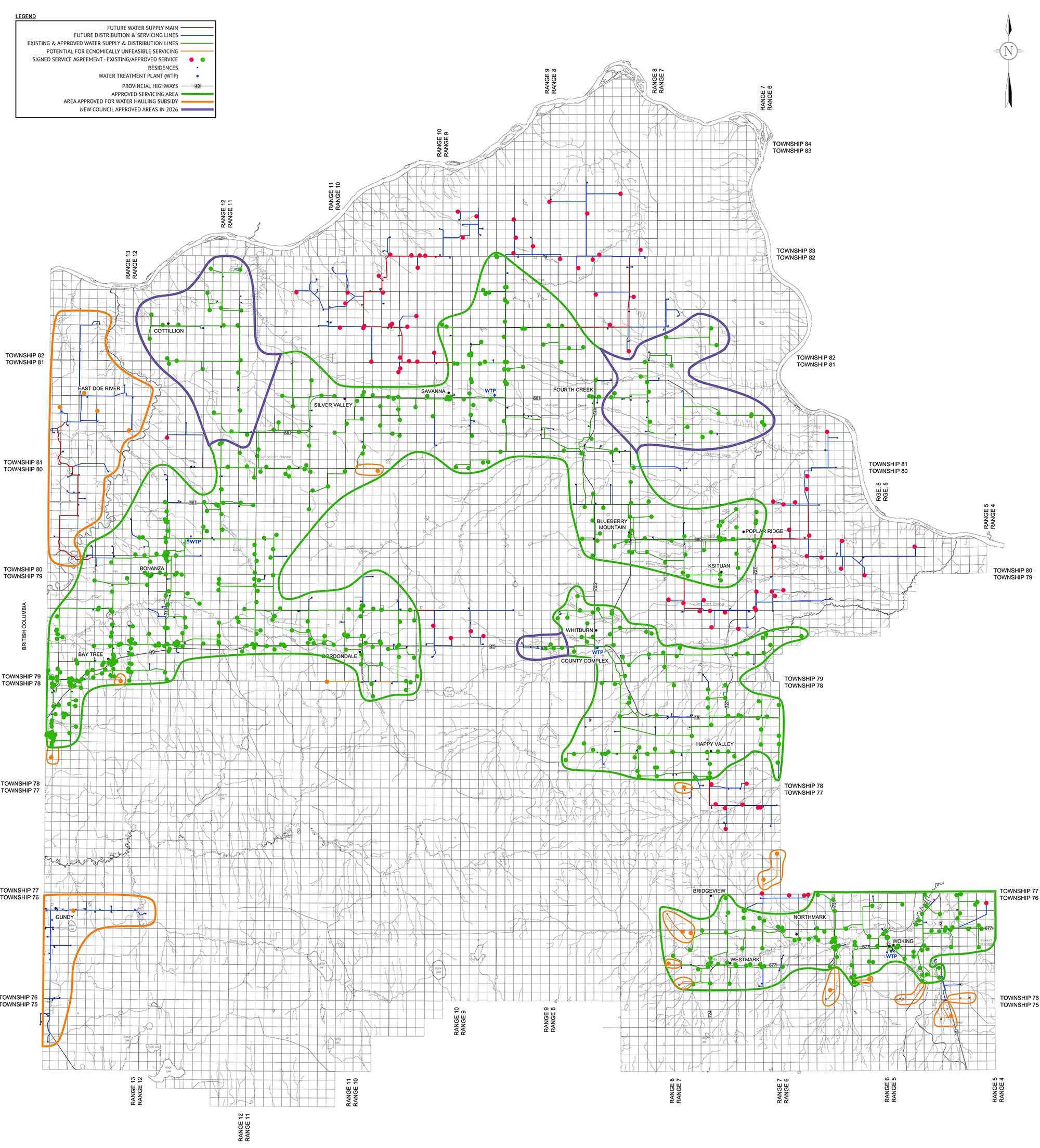 As of 2026, Council invites all resident as identified in the attached map that are not in areas designated under the Remote Potable Water Hauling Subsidy (identified in orange), to sign-up to be connected to the Rural Potable Water Network to have water delivered to their residence. There is no financial contribution required at the time of sign-up or once waterline is installed.